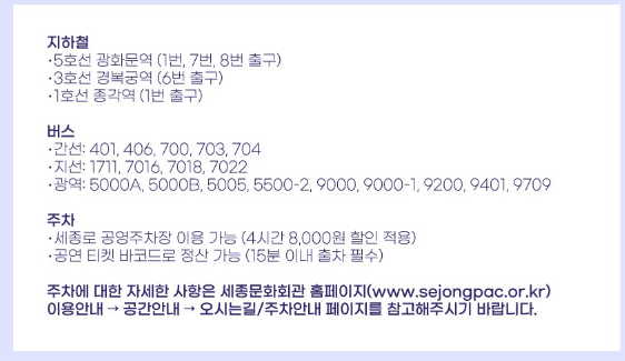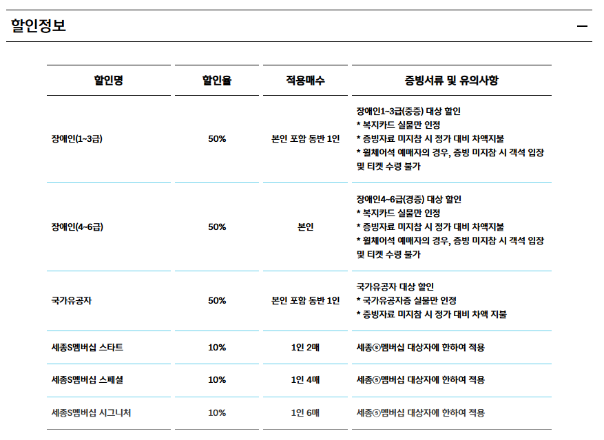 ✅ 휠체어석 예매는 세종문화회관 고객센터 전화 예매를 통해서만 가능합니다. (T.02-399-1000)
