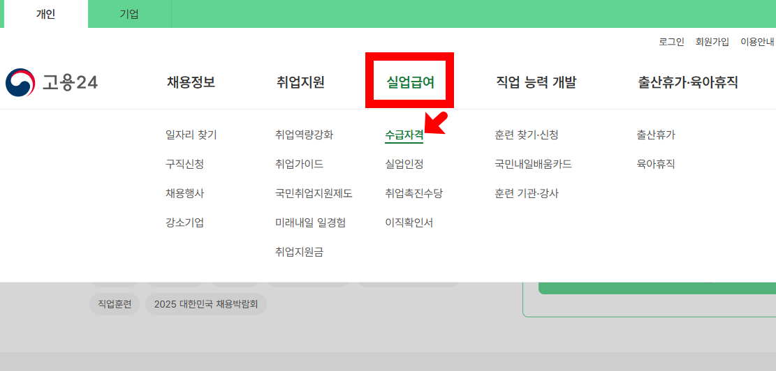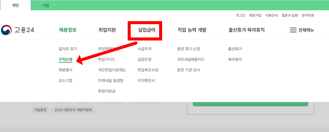 ✔ 로그인 후 "실업급여 신청" 메뉴 클릭