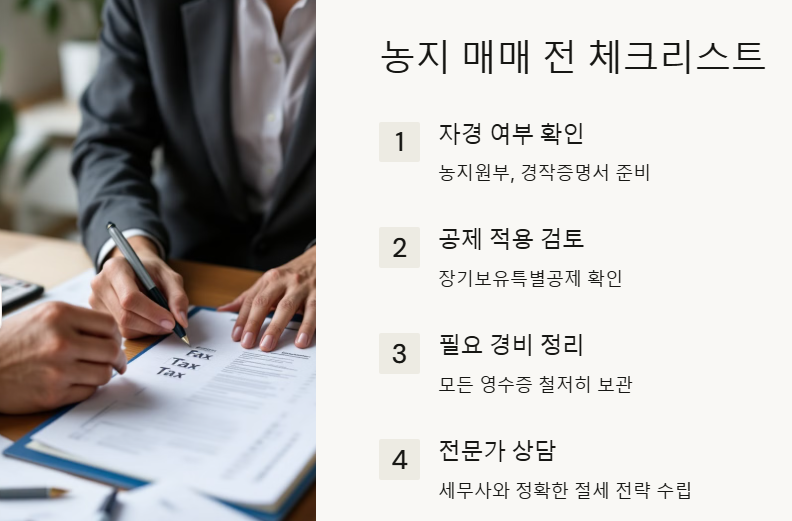 농지 매매 전, 세무 상담을 통해 정확한 절세 전략을 세우는 것이 가장 안전한 방법입니다.
