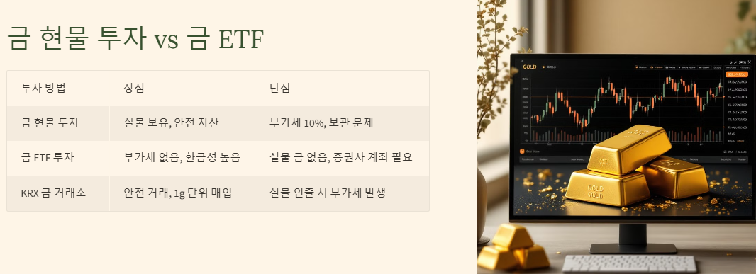 | 금 현물 투자 | 실물 보유 가능, 안전 자산 | 부가세 10%, 보관 문제 |