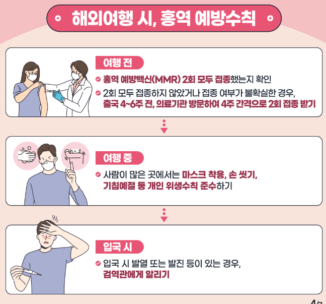 - 홍역 유행 국가 방문자는 출국 4~6주 전 예방접종 완료 권장