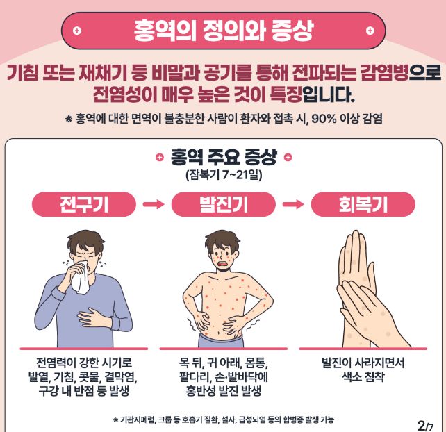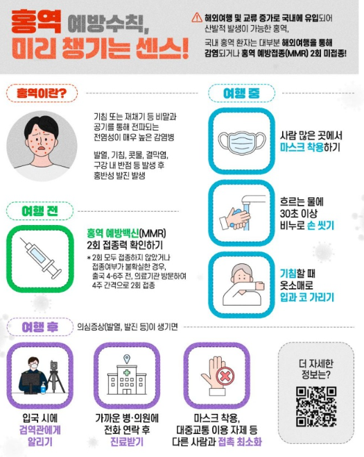 - 홍역 의심 증상 발생 시 즉시 보건소 또는 의료기관 신고 필요