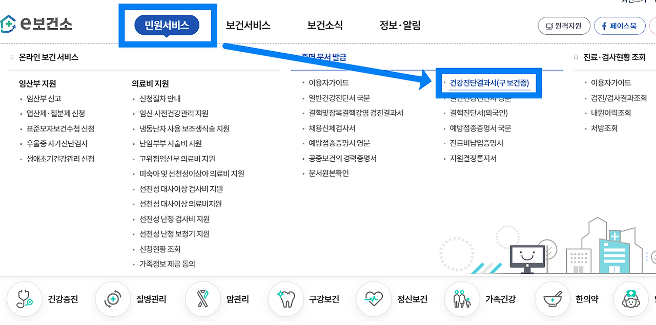 - 홈페이지 상단 메뉴에서 민원서비스 → “건강진단결과서(구 보건증)” 선택