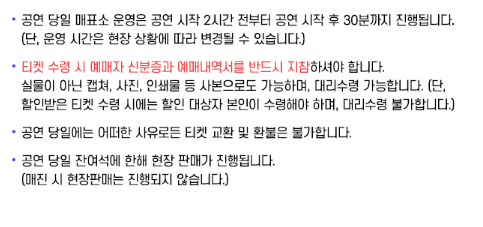 • 할인된 금액으로 예매를 하셔야 하며 정가로 예매된 티켓은 현장에서 할인받으실 수 없으니 예매 시 유의 바랍니다.