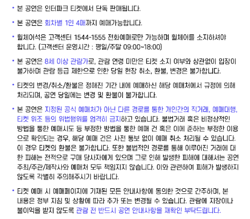 • 휠체어석은 인터파크 고객센터를 통해 접수 가능합니다.(☎1544-1555)