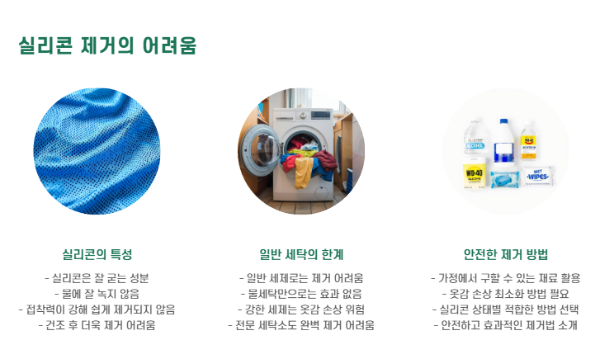 문제는, 실리콘은 잘 굳고 물에도 잘 안 녹는 성분이라 일반 세탁으론 제거가 어렵다는 점입니다.