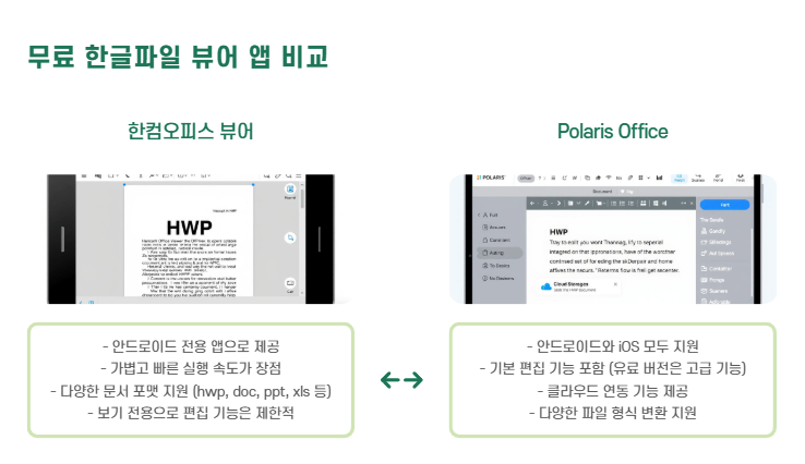 | 한컴오피스 뷰어 | 안드로이드 | 가볍고 빠름, 다양한 문서 포맷 지원 |