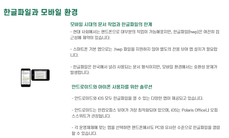 A. 스마트폰 기본 앱으로는 .hwp 파일을 지원하지 않기 때문에 전용 뷰어 앱 설치가 필요합니다.