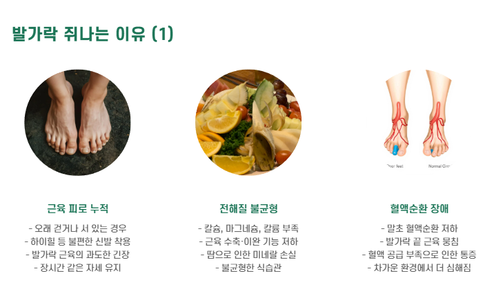- 칼슘, 마그네슘, 칼륨 부족 시 근육 수축·이완이 원활하지 않아 쥐가 생깁니다.