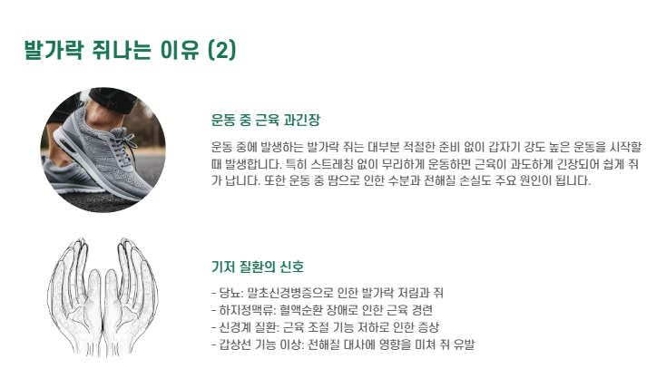 잠을 자다 깼을 때, 운동을 하다가, 혹은 가만히 있을 때 갑자기 발가락에 쥐가 나면서 통증을 느끼면 누구나 당황하게 됩니다. 이런 현상이 자주 반복된다면 단순히 ‘그럴 수도 있지’ 하고 넘기기보다는 정확한 원인 파악과 예방법을 아는 것이 중요합니다.