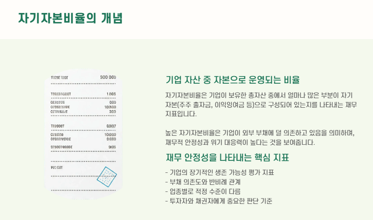 자기자본비율은 기업이 가진 자산 중에서 얼마나 자본(자기 돈)으로 운영되고 있는지를 보여주는 재무 안정성 지표입니다.