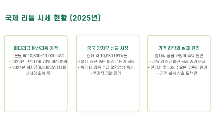 2025년 현재, 국제 리튬 가격은 과거 고점 대비 70% 이상 하락한 상황입니다. 하지만 중요한 건 '하락한 이유'가 일시적 공급 과잉이라는 점입니다.