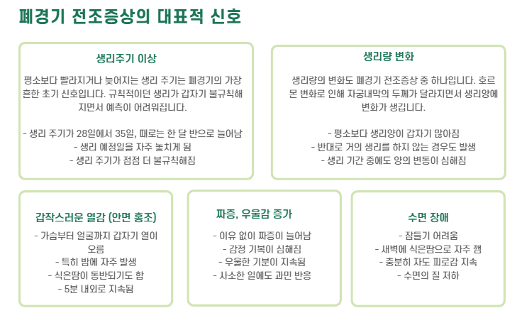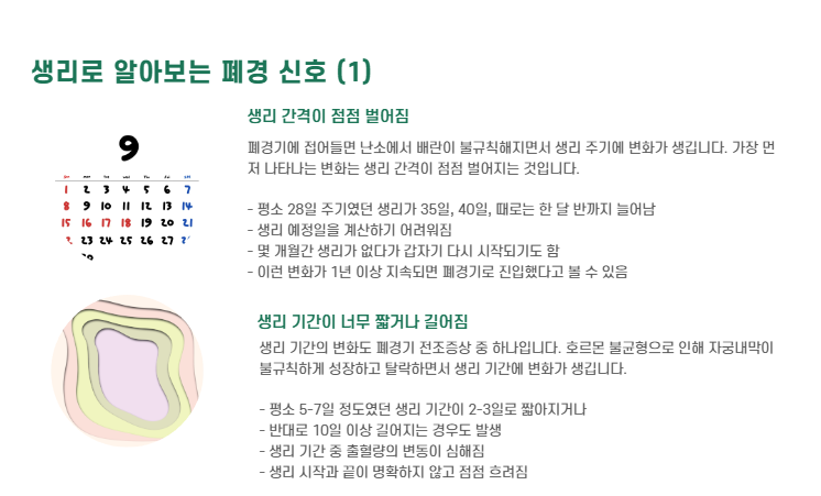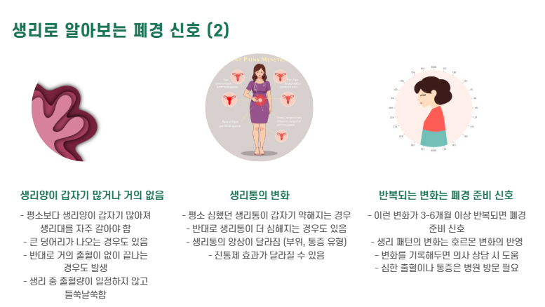 - 생리 간격이 점점 벌어짐 (예: 28일 → 35일 → 한 달 반)