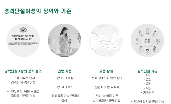 경력단절여성(경단녀)은 단순히 퇴직 후 무직인 여성이 아니라, ‘특정 사유’로 인해 경력이 단절된 여성을 말합니다.