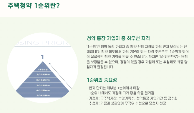 ‘1순위’란 청약 통장 가입자 중 청약 신청 자격을 가장 먼저 부여받는 단계입니다.