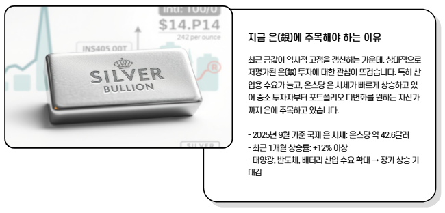 → 금은 보유 자산으로 안정성 중심, 은은 산업 수요와 가격 리레이팅 기대감으로 더 공격적 성격. 둘 다 병행 투자 추천.